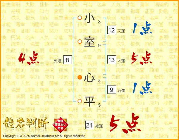 生活面を象徴する運勢です。外部から受ける影響力を表し、結婚運、家庭運や職場、環境への順応性を表します。総運から人運を引いた画数。姓や名が1文字の場合を除く。