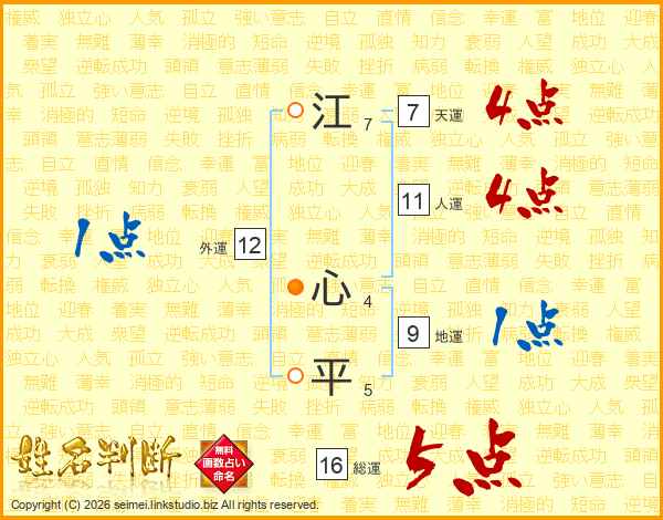 画数の奇数(○陽)と偶数(●陰)の配列で吉凶を占います。どちらかにかたよる名前は大凶名で避ける必要があります。画数の奇数偶数。