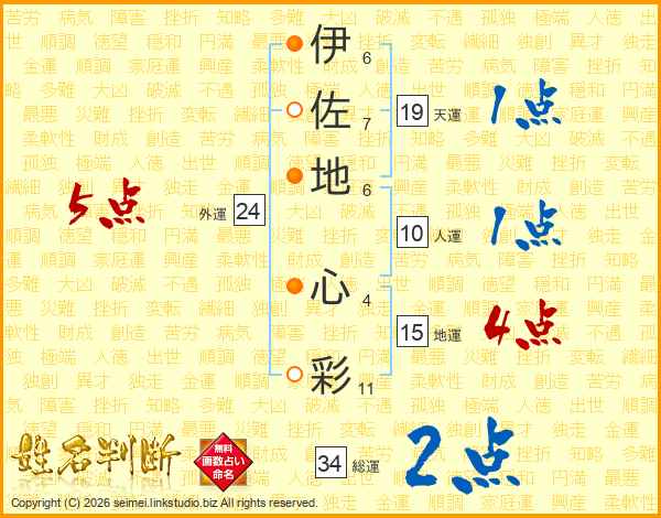 伊(6画)佐(7画)地(6画) 心(4画)彩(11画)
