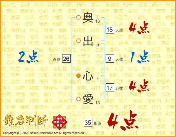 生活面を象徴する運勢です。外部から受ける影響力を表し、結婚運、家庭運や職場、環境への順応性を表します。総運から人運を引いた画数。姓や名が1文字の場合を除く。