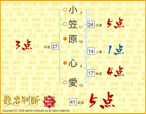 小(3画)笠(11画)原(10画) 心(4画)愛(13画)