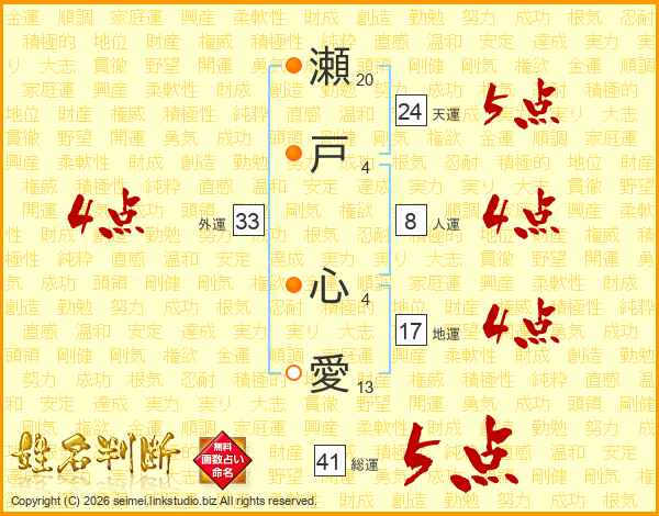 瀬戸心愛さんの外運は33画の4点!