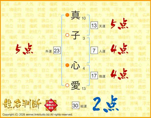 生活面を象徴する運勢です。外部から受ける影響力を表し、結婚運、家庭運や職場、環境への順応性を表します。総運から人運を引いた画数。姓や名が1文字の場合を除く。