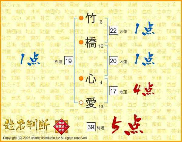 竹(6画)橋(16画) 心(4画)愛(13画)