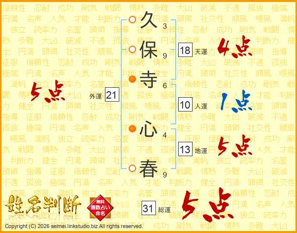 久(3画)保(9画)寺(6画) 心(4画)春(9画)