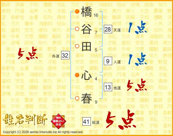 橋(16画)谷(7画)田(5画) 心(4画)春(9画)