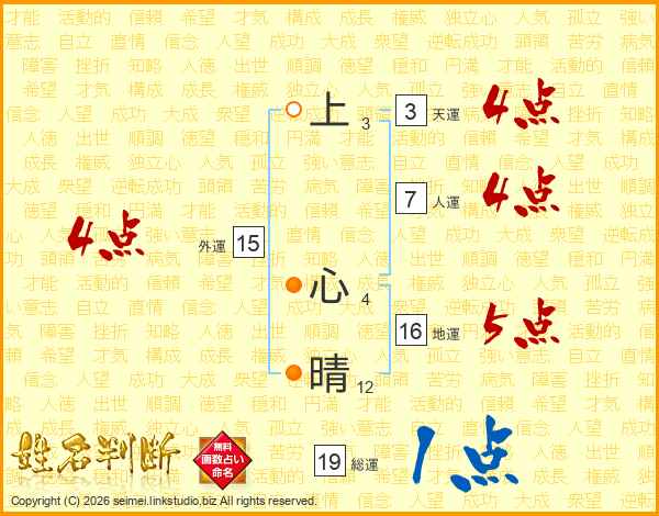 生活面を象徴する運勢です。外部から受ける影響力を表し、結婚運、家庭運や職場、環境への順応性を表します。総運から人運を引いた画数。姓や名が1文字の場合を除く。