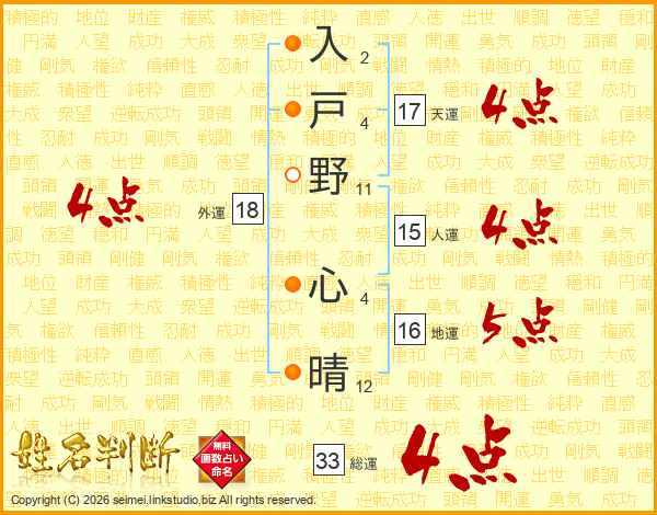 入(2画)戸(4画)野(11画) 心(4画)晴(12画)