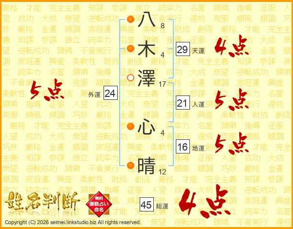 八(8画)木(4画)澤(17画) 心(4画)晴(12画)