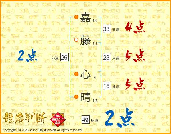 嘉(14画)藤(19画) 心(4画)晴(12画)