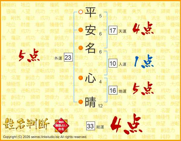 平(5画)安(6画)名(6画) 心(4画)晴(12画)