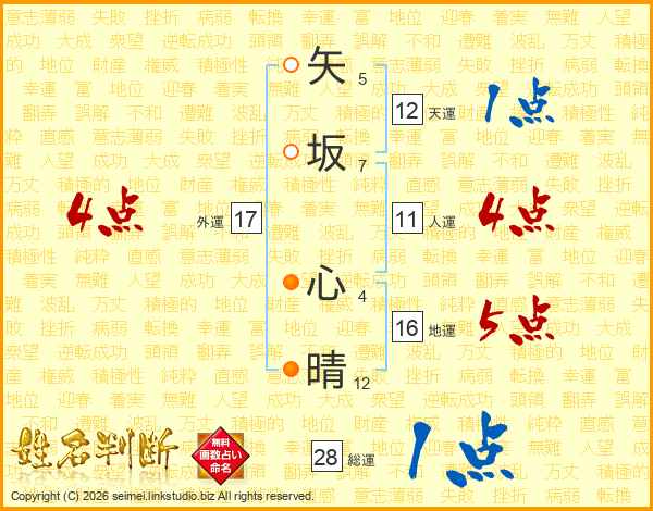 矢(5画)坂(7画) 心(4画)晴(12画)