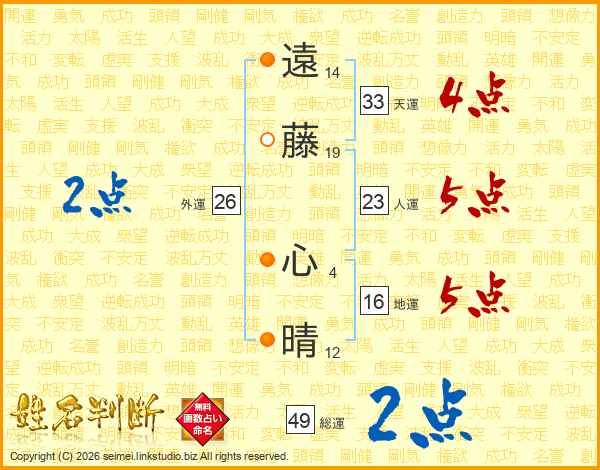 遠(14画)藤(19画) 心(4画)晴(12画)