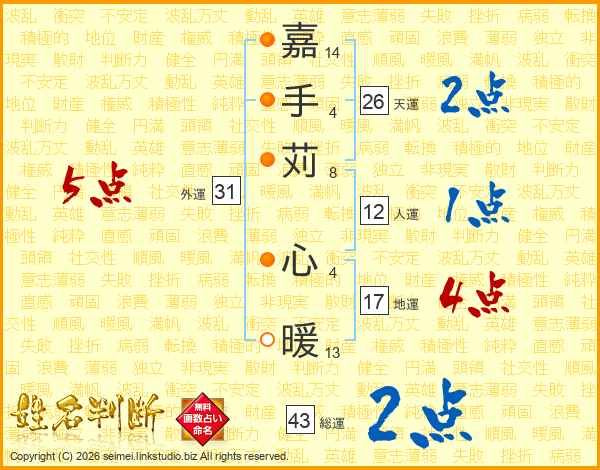 嘉(14画)手(4画)苅(8画) 心(4画)暖(13画)