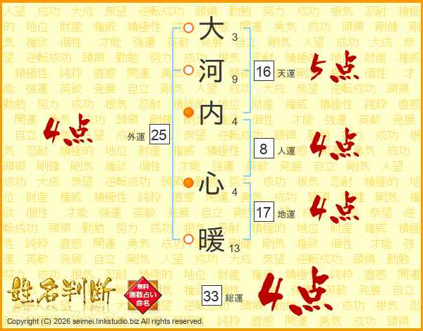 大(3画)河(9画)内(4画) 心(4画)暖(13画)
