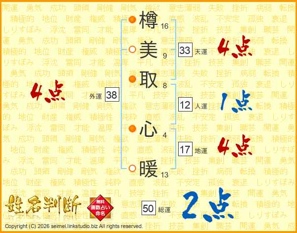樽(16画)美(9画)取(8画) 心(4画)暖(13画)