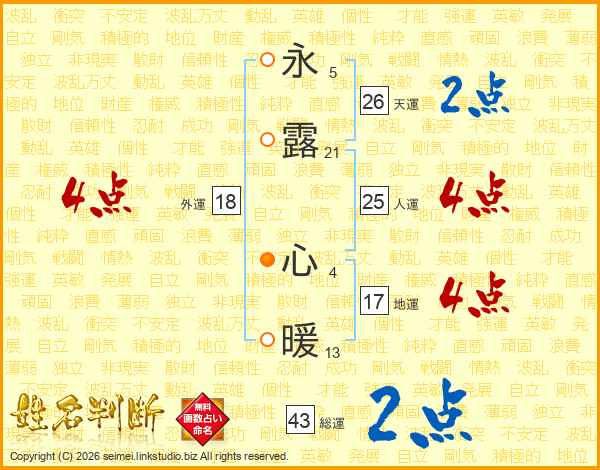 生活面を象徴する運勢です。外部から受ける影響力を表し、結婚運、家庭運や職場、環境への順応性を表します。総運から人運を引いた画数。姓や名が1文字の場合を除く。