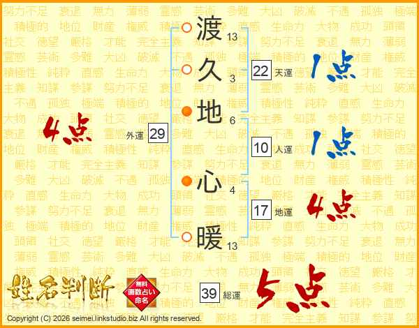 渡(13画)久(3画)地(6画) 心(4画)暖(13画)