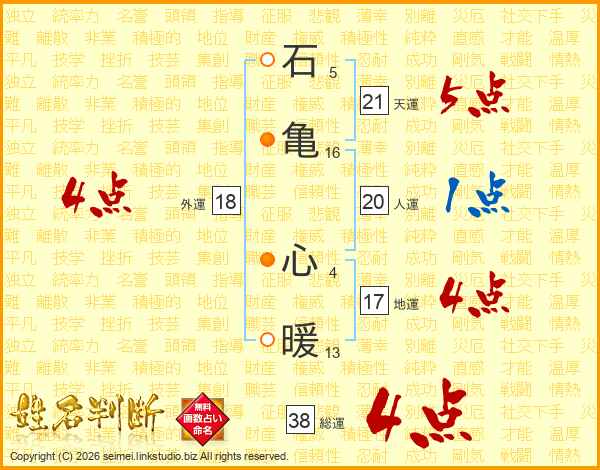 石(5画)亀(16画) 心(4画)暖(13画)