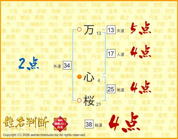 生活面を象徴する運勢です。外部から受ける影響力を表し、結婚運、家庭運や職場、環境への順応性を表します。総運から人運を引いた画数。姓や名が1文字の場合を除く。