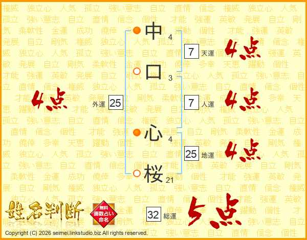 生活面を象徴する運勢です。外部から受ける影響力を表し、結婚運、家庭運や職場、環境への順応性を表します。総運から人運を引いた画数。姓や名が1文字の場合を除く。