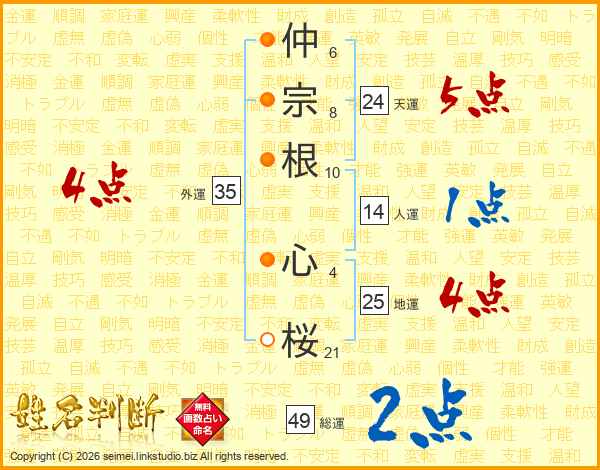 仲(6画)宗(8画)根(10画) 心(4画)桜(21画)