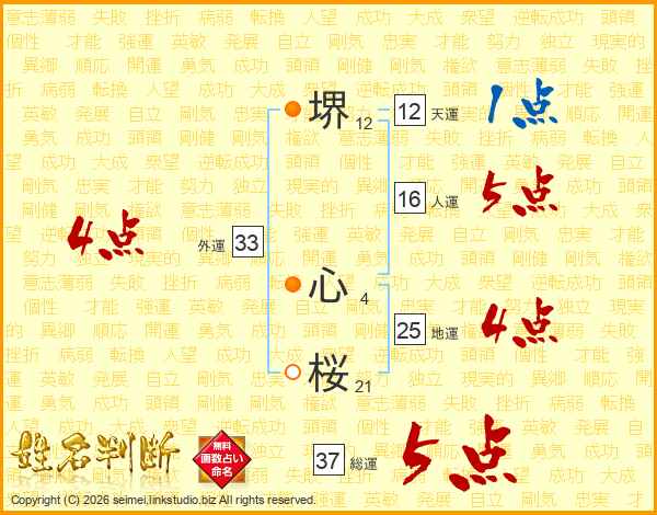 生活面を象徴する運勢です。外部から受ける影響力を表し、結婚運、家庭運や職場、環境への順応性を表します。総運から人運を引いた画数。姓や名が1文字の場合を除く。