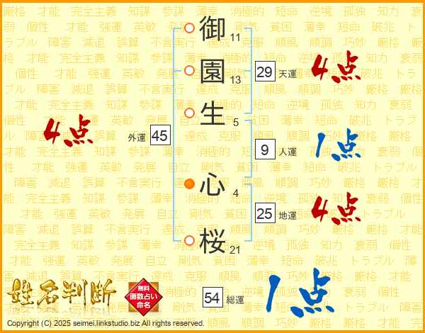 御(11画)園(13画)生(5画) 心(4画)桜(21画)