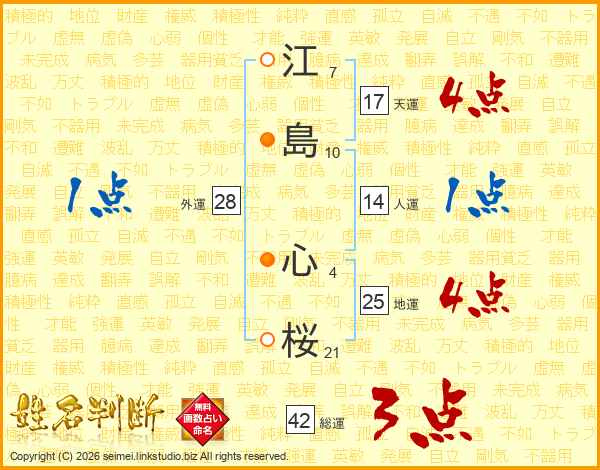 生活面を象徴する運勢です。外部から受ける影響力を表し、結婚運、家庭運や職場、環境への順応性を表します。総運から人運を引いた画数。姓や名が1文字の場合を除く。