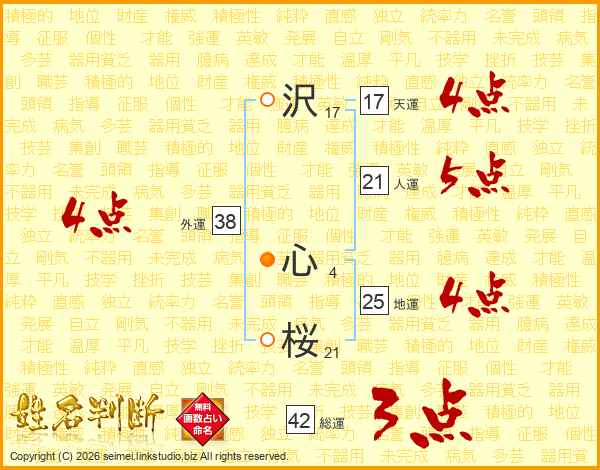 沢(17画) 心(4画)桜(21画)