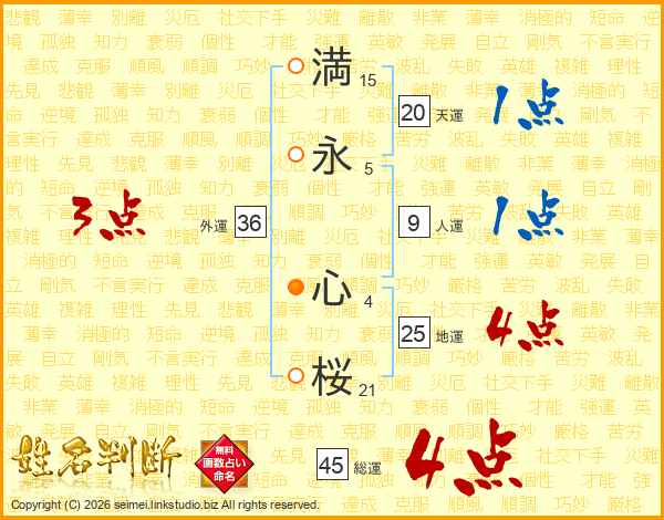 生活面を象徴する運勢です。外部から受ける影響力を表し、結婚運、家庭運や職場、環境への順応性を表します。総運から人運を引いた画数。姓や名が1文字の場合を除く。