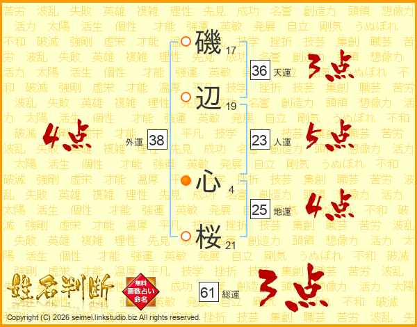 磯(17画)辺(19画) 心(4画)桜(21画)