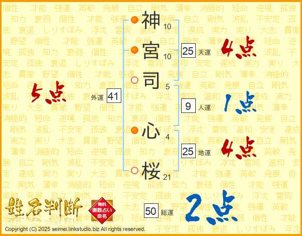 神(10画)宮(10画)司(5画) 心(4画)桜(21画)