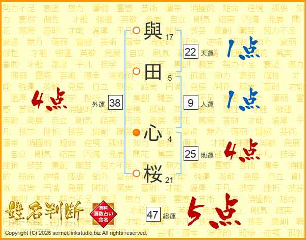 生活面を象徴する運勢です。外部から受ける影響力を表し、結婚運、家庭運や職場、環境への順応性を表します。総運から人運を引いた画数。姓や名が1文字の場合を除く。