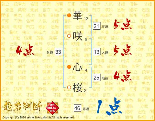 生活面を象徴する運勢です。外部から受ける影響力を表し、結婚運、家庭運や職場、環境への順応性を表します。総運から人運を引いた画数。姓や名が1文字の場合を除く。