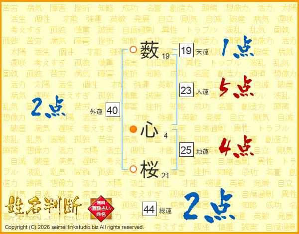 生活面を象徴する運勢です。外部から受ける影響力を表し、結婚運、家庭運や職場、環境への順応性を表します。総運から人運を引いた画数。姓や名が1文字の場合を除く。