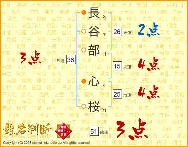 長(8画)谷(7画)部(11画) 心(4画)桜(21画)