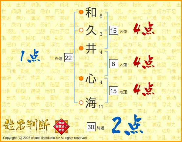 和(8画)久(3画)井(4画) 心(4画)海(11画)