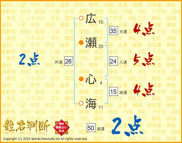 生活面を象徴する運勢です。外部から受ける影響力を表し、結婚運、家庭運や職場、環境への順応性を表します。総運から人運を引いた画数。姓や名が1文字の場合を除く。