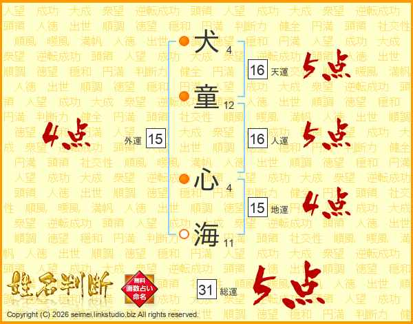 犬(4画)童(12画) 心(4画)海(11画)