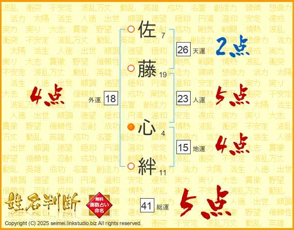 佐(7画)藤(19画) 心(4画)絆(11画)