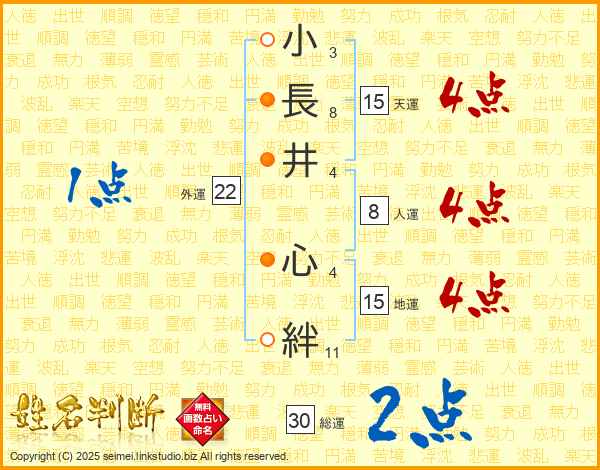 小(3画)長(8画)井(4画) 心(4画)絆(11画)