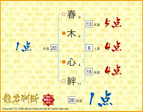 春(9画)木(4画) 心(4画)絆(11画)