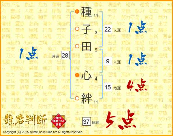 種(14画)子(3画)田(5画) 心(4画)絆(11画)