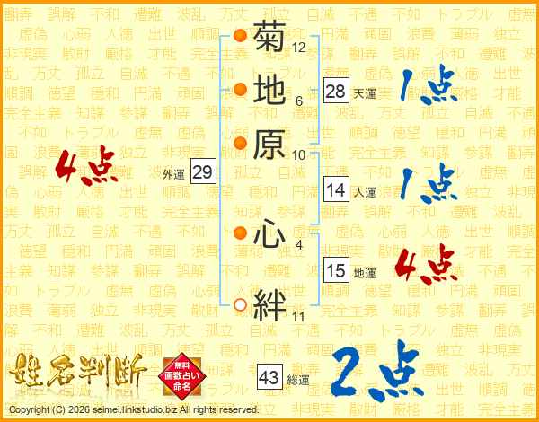 菊(12画)地(6画)原(10画) 心(4画)絆(11画)