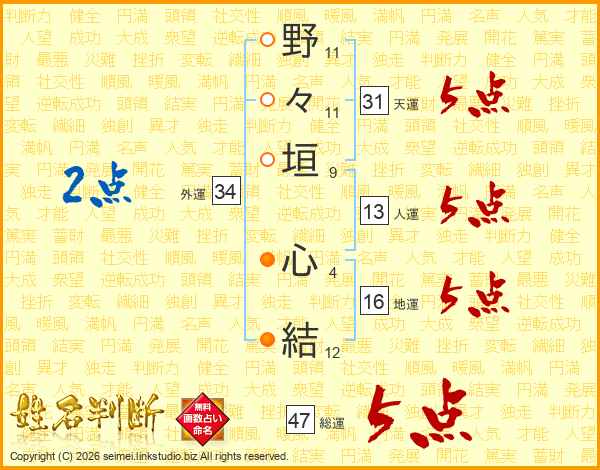 野(11画)々(11画)垣(9画) 心(4画)結(12画)