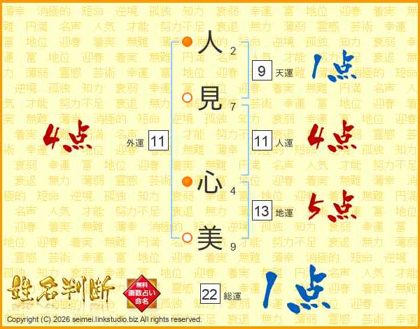 人(2画)見(7画) 心(4画)美(9画)