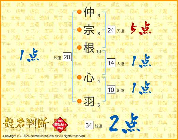 仲(6画)宗(8画)根(10画) 心(4画)羽(6画)