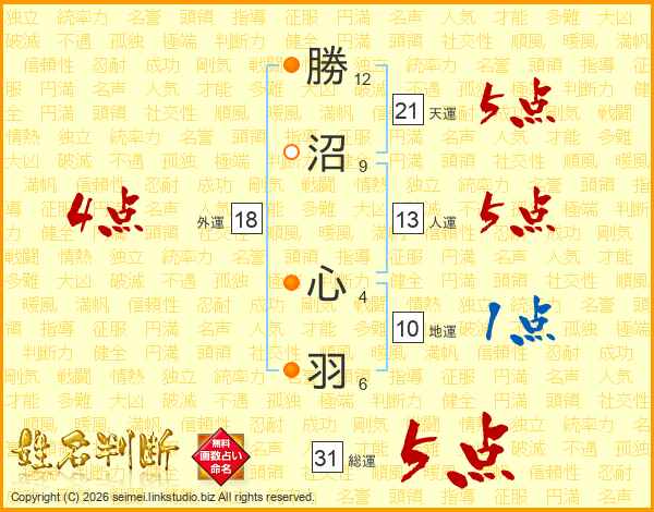 勝(12画)沼(9画) 心(4画)羽(6画)