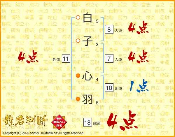 あなたの人生を表す1番重要な運勢です。生涯を通じて影響する総合運となり、主に50歳以降の晩年期に影響を及ぼします。苗字と名前の合計画数。